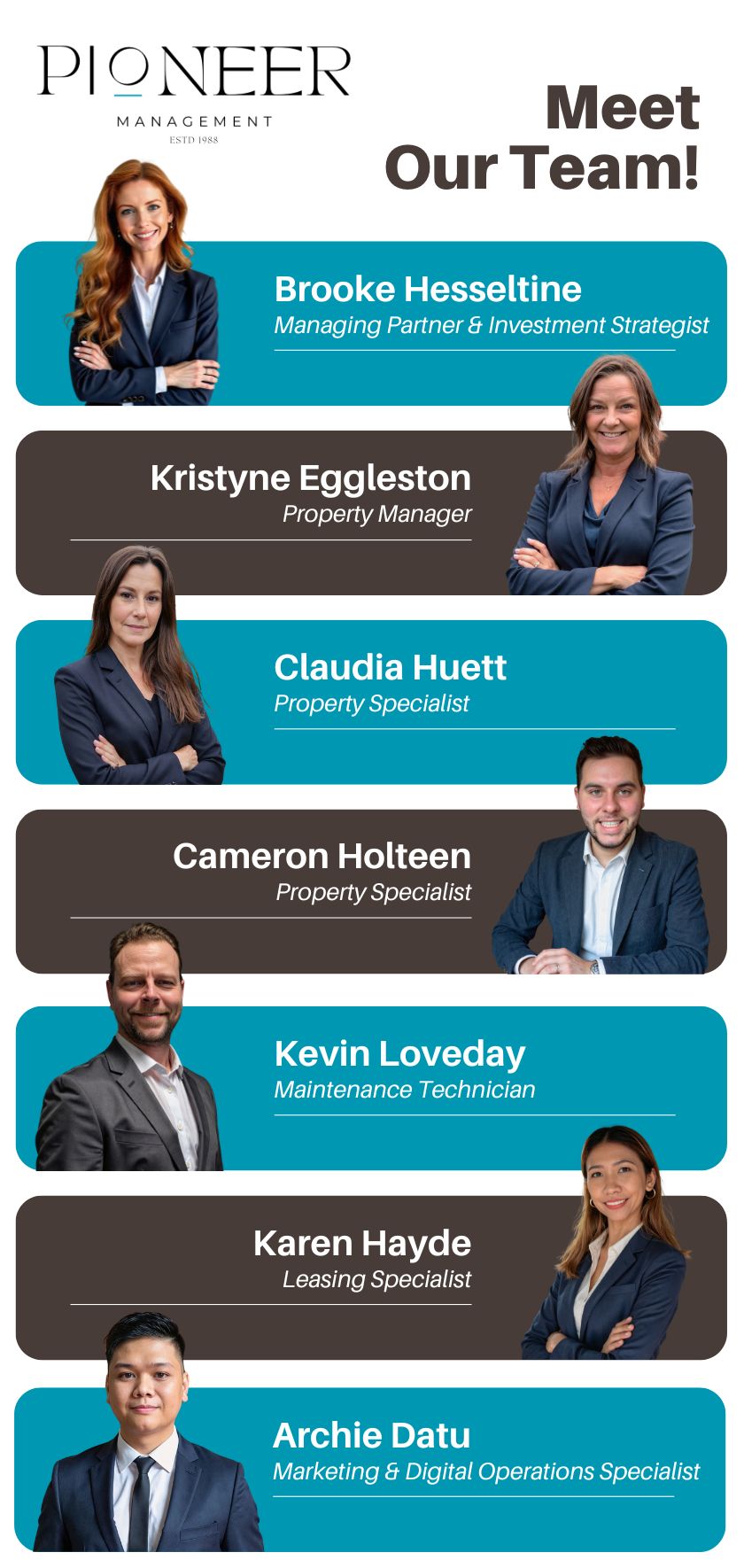 We believe great property management starts with a dedicated team, and at Pioneer Management, our experienced professionals work hard every day to ensure your rental properties are well-managed, tenants are taken care of, and your investments thrive. As a privately owned and operated company, we take pride in our knowledgeable and dedicated team. Our licensed property managers and experienced staff are committed to providing exceptional service and support to our clients.
